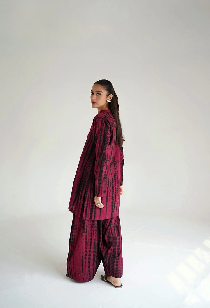 A breathable shalwar and kurta set made from hand-woven lilen. Featuring black stripes on burgundy base